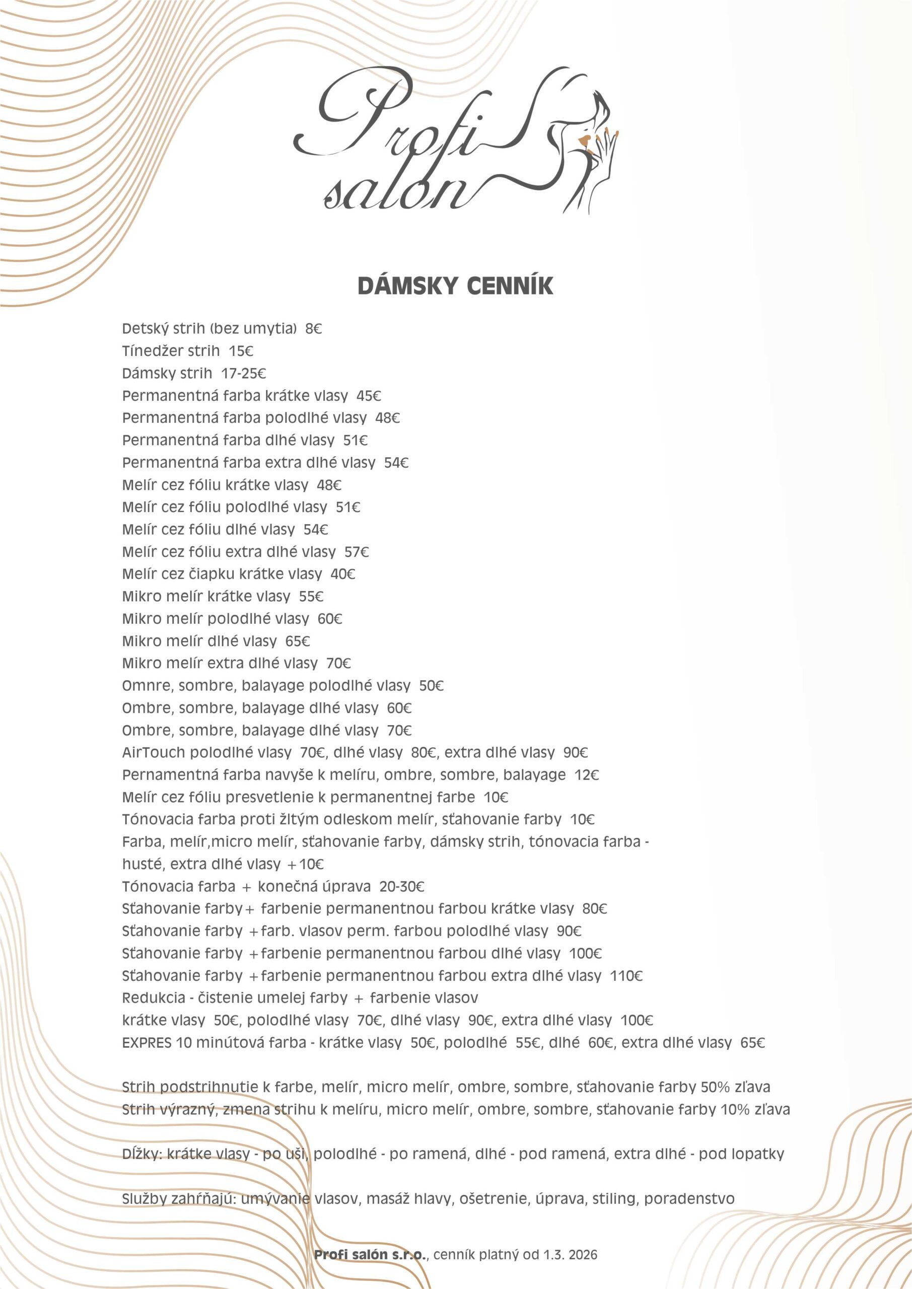 ** SLUŽBY ZAHŔŇAJÚ: umývanie vlasov, masáž hlavy, ošetrenie, úprava, styling, poradenstvo
